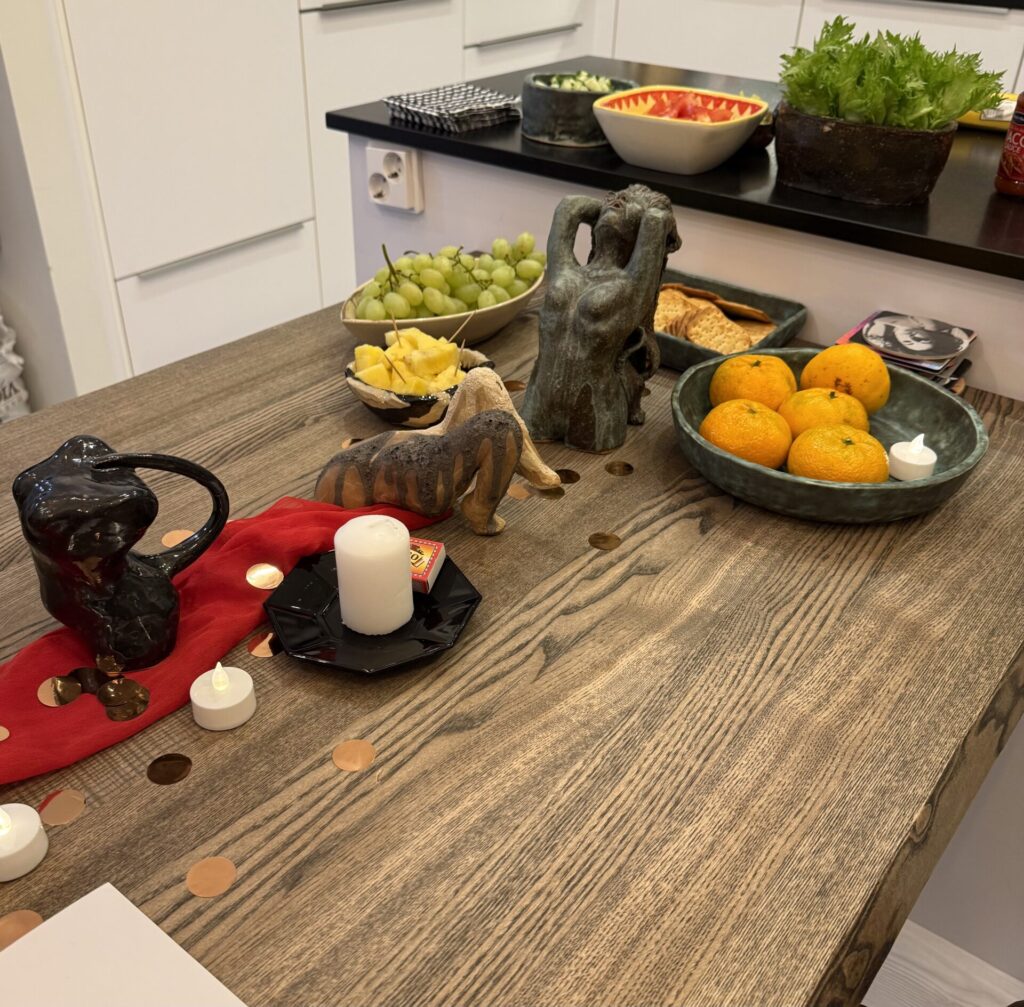 First group test game table. We decorated with thematic ceramics, LED and real candles, and whatever you call those sort of big glitter pieces.